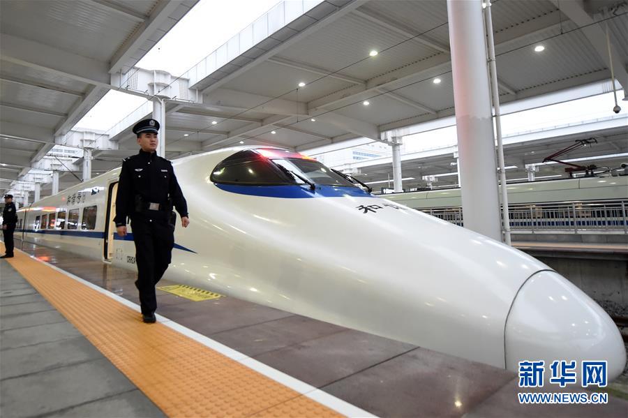 12月6日,一名铁路民警从重庆北至西安北首发列车旁走过。当日上午8点20分,重庆至西安首列动车组列车从重庆北火车站驶出,预计将于当天13点42分到达西安北火车站。重庆至西安开通动车得益于西安至成都高速铁路的全线贯通,重庆至西安最短旅行时间将从目前的9小时压缩到约5小时。新华社记者 唐奕 摄