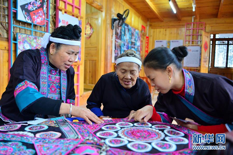 12月7日,在三江侗绣博物馆,侗绣技艺传承人覃奶时清(中)、杨甜(左)在向绣娘覃月凤传授侗绣技艺。侗绣是侗族特有的传统技艺,具有悠久的历史,被列为广西壮族自治区非物质文化遗产。近年来,广西三江县同乐乡大力推动侗绣技艺传承,组织技艺传承人将侗绣技艺传授给当地妇女,并将她们的侗绣作品销往国内外,以传承非遗技艺助力群众脱贫增收。据了解,同乐乡目前已培养绣娘500余人,从2017年1月至今,侗绣产值已达500万元。新华社记者李绚丽 摄