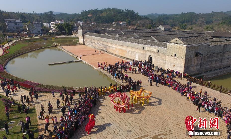 12月9日,航拍江西龙南县境内的关西新围,游客和嘉宾正在这里品尝客家千人宴。当天,“中国围屋之乡”江西龙南县关西围景区人头攒动,热情的客家龙南人舞龙、舞狮,摆千人宴,以客家礼仪热烈欢迎游客的到来。今年3月以来,以关西新围为核心,联合周边西昌围、田心围、大书房、鹏皋围等7个围屋的“关西围景区”突围变身“换新颜”,规划占地面积918亩,总投资额为2.5亿元。刘占昆 摄