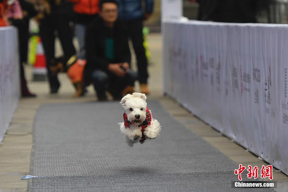 12月9日,别开生面的“汪星人”趣味运动会在昆明举办,吸引众多市民带着爱犬来参赛。图为小狗四腿离地奋力飞奔。 中新社记者 刘冉阳摄