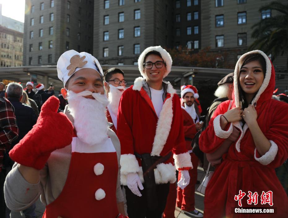 当地时间12月9日,美国旧金山联合广场,一年一度的圣诞老人大聚会。 中新社记者 刘丹 摄