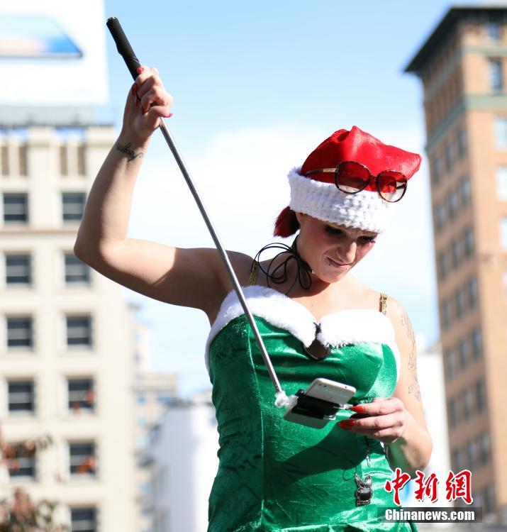 当地时间12月9日,美国旧金山联合广场,一年一度的圣诞老人大聚会。 中新社记者 刘丹 摄