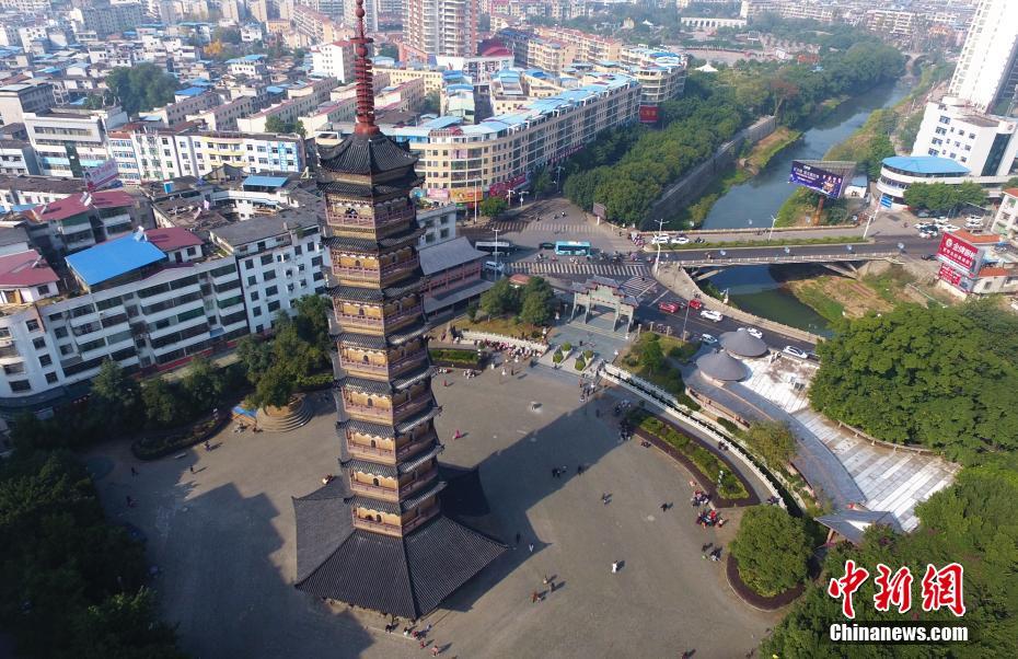 12月10日,航拍位于江西赣州市信丰县县城的北宋“江南第一高塔”——大圣寺塔,造型雄伟,结构严谨。信丰大圣寺塔建于北宋治平元年(公元1064年),为平面六角形九级楼阁式砖塔,大圣寺塔九层十八级,塔高66.45米,史称“凌霄绝顶,通省无以伦比”,为长江以南现存最高宋塔,堪称“江南第一塔”。刘占昆 摄