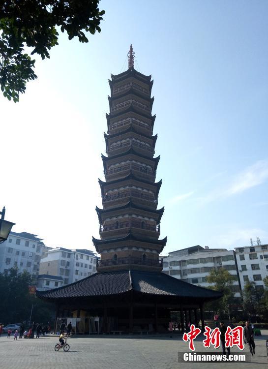 12月10日,航拍位于江西赣州市信丰县县城的北宋“江南第一高塔”——大圣寺塔,造型雄伟,结构严谨。信丰大圣寺塔建于北宋治平元年(公元1064年),为平面六角形九级楼阁式砖塔,大圣寺塔九层十八级,塔高66.45米,史称“凌霄绝顶,通省无以伦比”,为长江以南现存最高宋塔,堪称“江南第一塔”。刘占昆 摄
