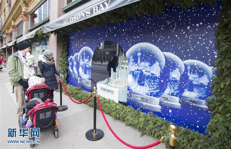 12月11日,在加拿大多伦多,行人观看海湾百货公司旗舰店新布置的圣诞橱窗。