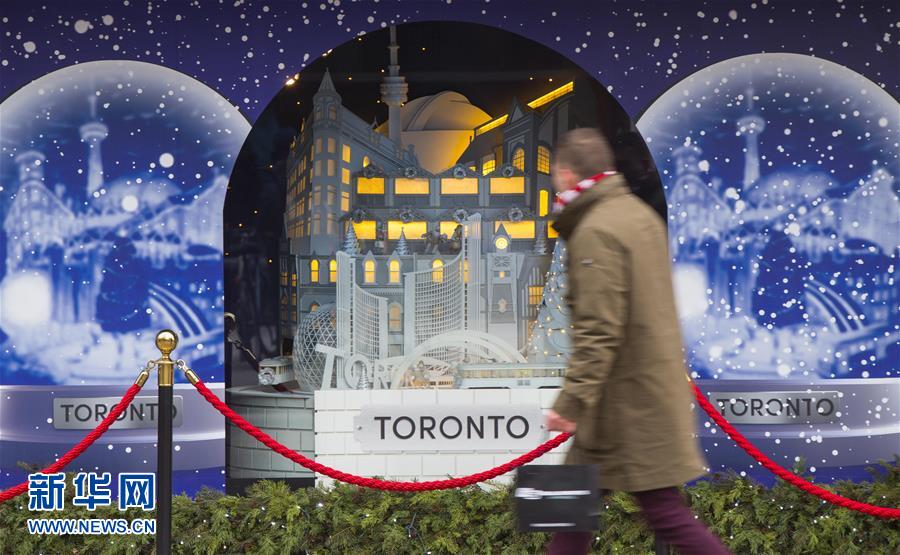 12月11日,在加拿大多伦多,一名行人经过海湾百货公司旗舰店新布置的圣诞橱窗。