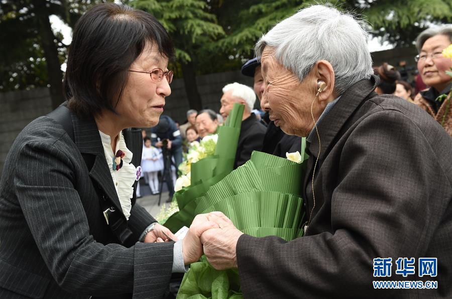 2016年4月4日,南京大屠杀历史学者松冈环(左)在南京参加祭奠活动时与南京大屠杀幸存者杨翠英交流。