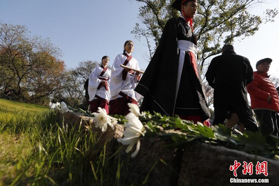 12月13日是南京大屠杀死难者国家公祭日,全国多地举行悼念活动。上海淞沪抗战纪念馆前,23位身着祭祀服饰的学子在这里念祭文,悼念革命先辈。中新社记者 殷立勤 摄