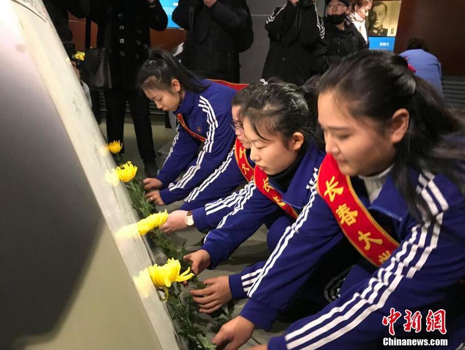 12月13日是南京大屠杀死难者国家公祭日,全国多地举行悼念活动。在长春伪满皇宫博物院东北沦陷史陈列馆,学生们向英雄谱革命烈士献花。中新社记者 张瑶 摄