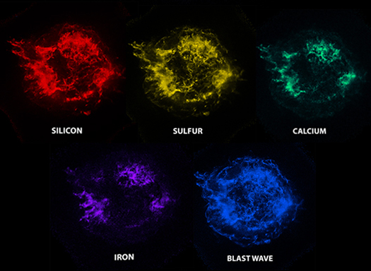 图为爆炸残留物中不同元素的分布:硅(红色)、硫磺(黄色)、钙(绿色)、铁(紫色)。每种元素都会产生在窄能量范围内的x射线。爆炸冲击波则是外环的蓝色。图片来源:NASA官网