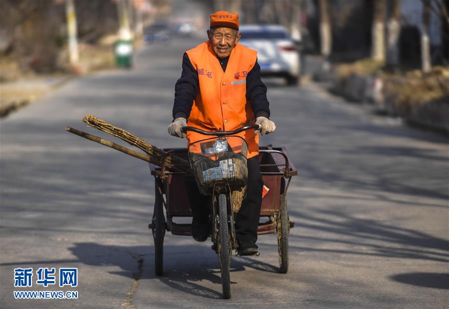 12月13日,李德玉老人骑车去村里打扫卫生。今年86岁的李德玉是河北省大城县臧屯乡刘演马村一名老党员,自20世纪90年代以来,每天义务为村里清扫街道。他说,只要还能动,就会将义务清扫村街继续下去。新华社记者 李晓果 摄