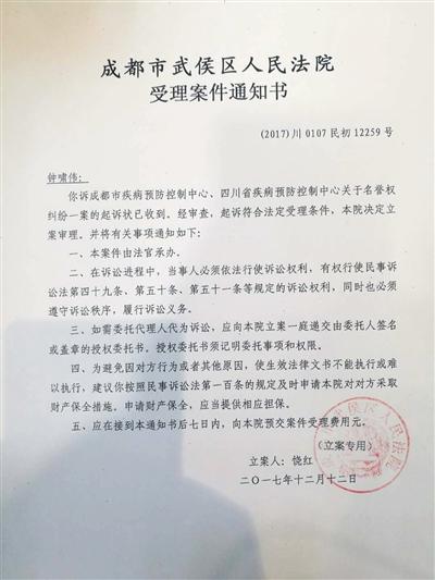 他提起民事诉讼,起诉成都市疾控中心、四川省疾控中心,要求对方赔礼道歉,赔偿从2008年至今造成的经济损失和精神损害。今年12月12日,成都市武侯区法院受理了案件。