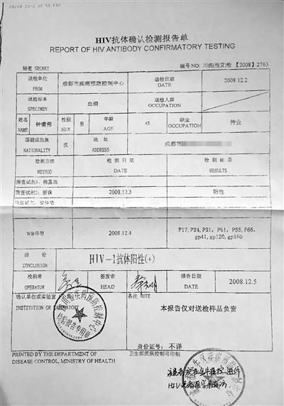 检测报告单显示,其血样经成都市疾控中心送检、四川省疾控中心确证,被诊断为HIV-1抗体阳性。这意味着他感染了艾滋病毒。
