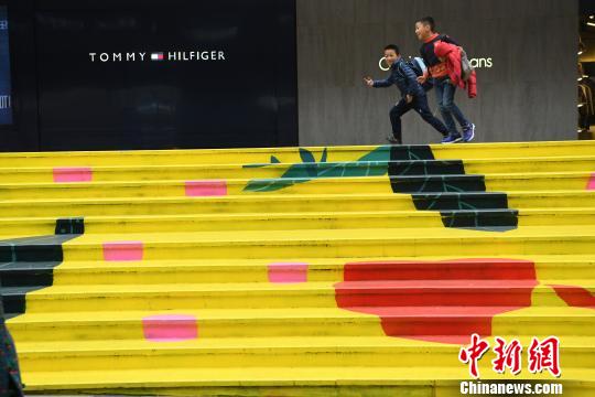 12月14日,重庆杨家坪步行街上一室外台阶被装饰成五颜六色,绚丽的彩色吸引路人。