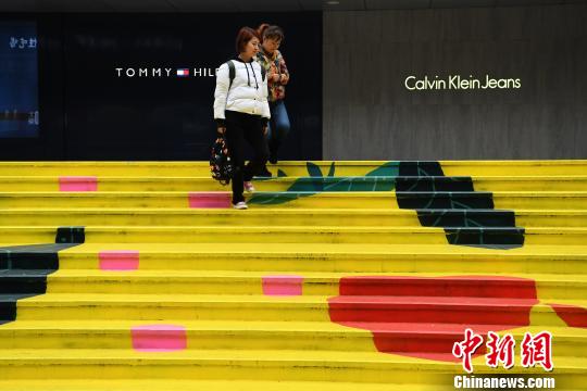 图为路人经过五颜六色的台阶。 陈超 摄