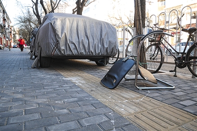 12月15日,东城区夕照寺街,一辆小轿车停在盲道上,一把坏掉的椅子被扔在盲道边。新京报记者 王嘉宁 摄