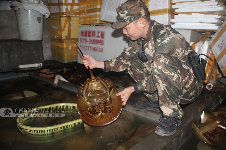 地角所边防派出所民警和渔政部门工作人员查获东方鲎。广西新闻网通讯员 张勇摄
