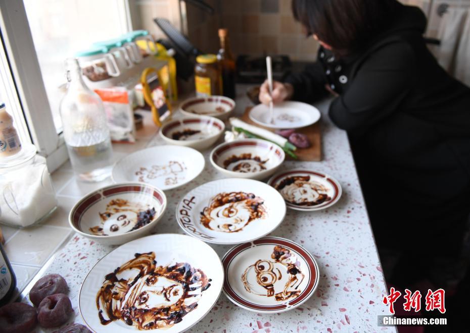 李小花在长春的家中用黄豆酱和老抽做颜料,用勺子、筷子做画笔,用盘子做画板,描绘出可爱的卡通图案。据她讲,创作“盘中画”的原因,是为让三岁的儿子爱上吃饭。中新社记者张瑶 摄