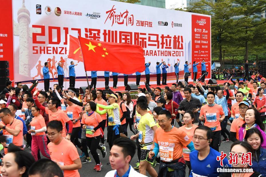 12月17日,2017深圳国际马拉松在深南大道上开跑,来自多个国家和地区的3万名运动员分别参加全程马拉松、半程马拉松、6公里马拉松比赛。本届马拉松赛事成功入选中国田径协会、中央电视台共同主办的国家级IP“奔跑中国”马拉松系列赛,是“奔跑中国”的年度收官之战。中新社记者 陈文 摄