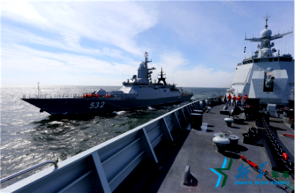 实施情况:中俄双方舰艇混合编队,中方参演兵力包括导弹驱逐舰合肥舰、导弹护卫舰运城舰、综合补给舰骆马湖舰以及舰载直升机、陆战队员等,俄方参演兵力包括“勇敢”号、“守护”号护卫舰和辅助船等舰艇,以及固定翼飞机、直升机和陆战队员等。