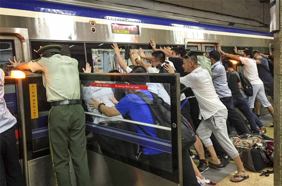 2017年8月3日,北京地铁2号线东直门站,站台工作人员和乘客合力推起列车一侧营救一名跳入轨道被困的男子。该男子随后送医不治身亡。 宋茂泽 摄