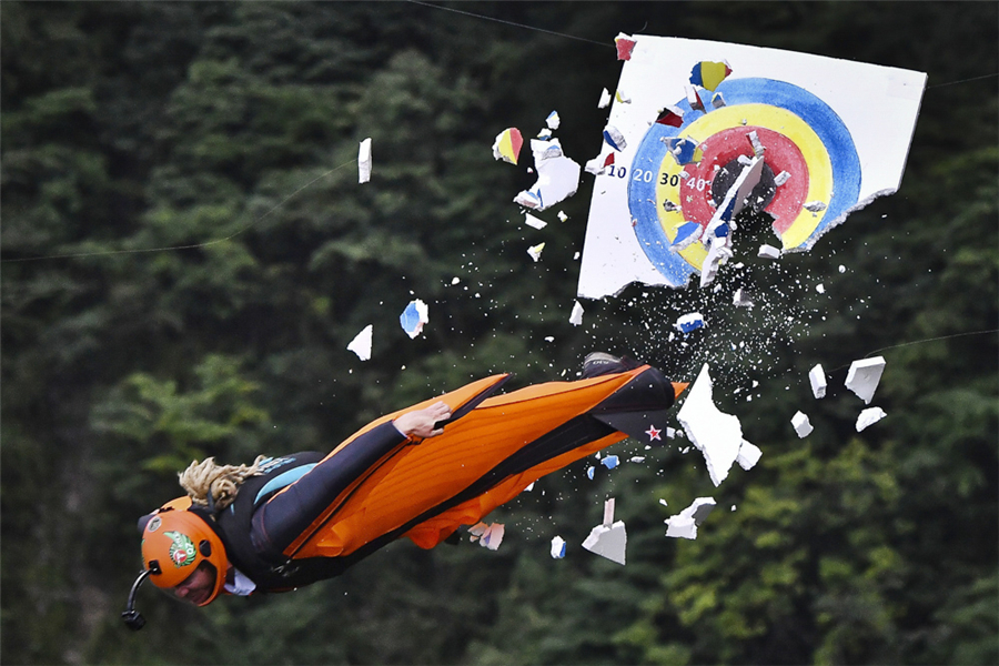 2017年9月11日,湖南张家界,英国选手萨姆•哈迪在2017卡拉宝翼装飞行世锦赛精准穿靶比赛中。 邵颖 摄