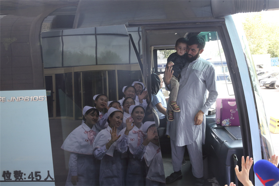 2017年9月13日,新疆医科大学第一附属医院,医护人员送别首批在中国红十字会“天使之旅—— 一带一路大病患儿人道救助计划阿富汗行动”中完成手术治疗出院的先心病儿童和陪护家属。 王敬 摄