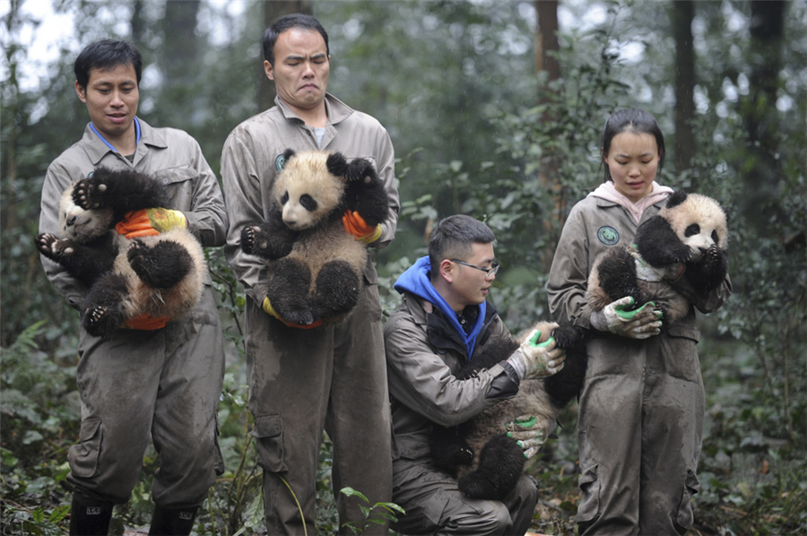 2017年1月11日,四川雅安碧峰峡基地,中国大熊猫保护研究中心的工作人员抱着熊猫宝宝参加迎新年活动。何海洋 摄