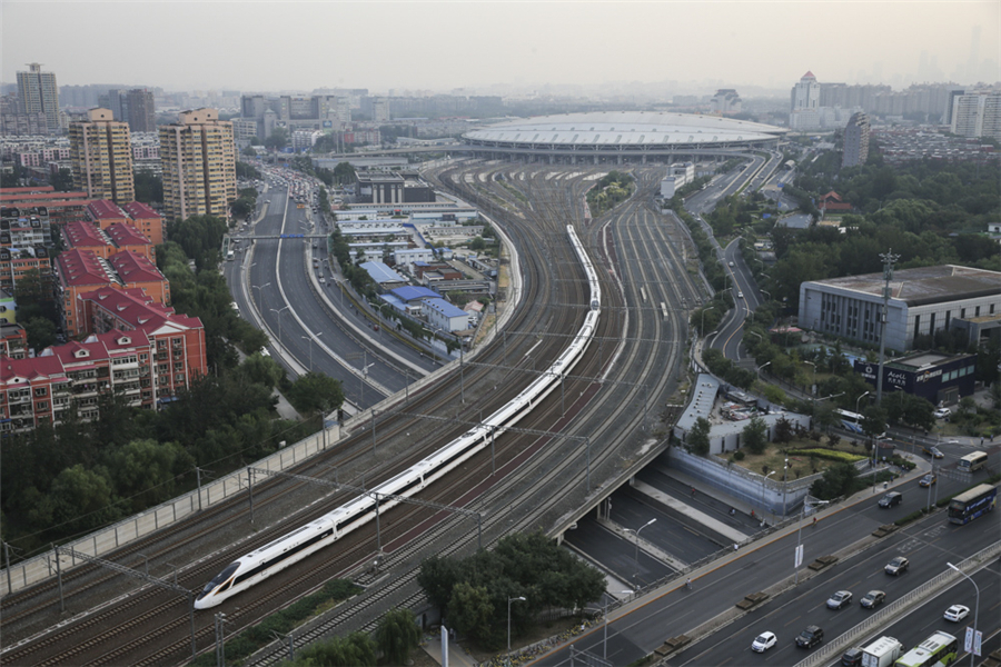 2017年9月21日,北京,京沪高铁“复兴号”G5次列车驶出北京南站。当日起,7对“复兴号”高铁列车在京沪高铁线率先实现350公里时速运营,标志着我国成为世界高铁商业运营速度最快的国家。 陈维松 摄