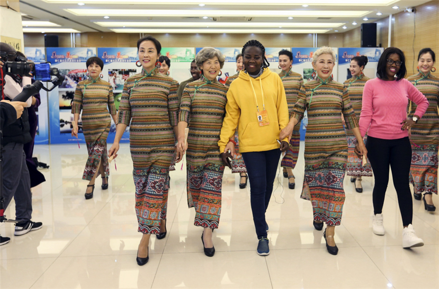 2017年10月21日,北京朝阳养老服务中心,老年模特队与在京参加十九大报道的外国媒体记者同走“模特步”。 王壮飞 摄