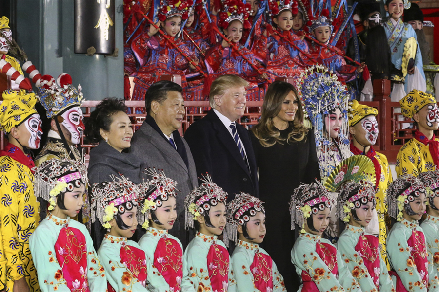 2017年11月8日,北京故宫博物院,国家主席习近平和夫人彭丽媛陪同来华进行国事访问的美国总统特朗普和夫人梅拉尼娅共同欣赏京剧表演后同演员们合影。 武治义 摄