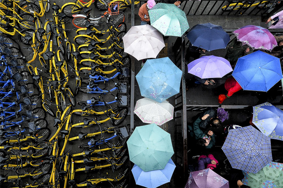 2017年3月24日,北京,人们在一处被共享单车包围的公交车站排队等车。 郝羿 摄