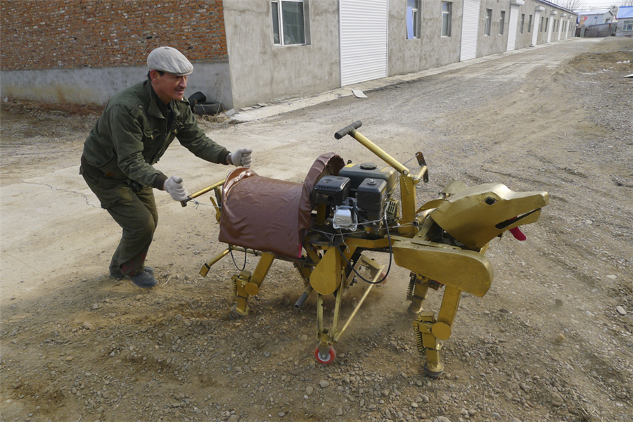 2017年4月5日,黑龙江黑河,农民富振林展示他利用废旧钢材自制的机器人。 邱齐龙 摄