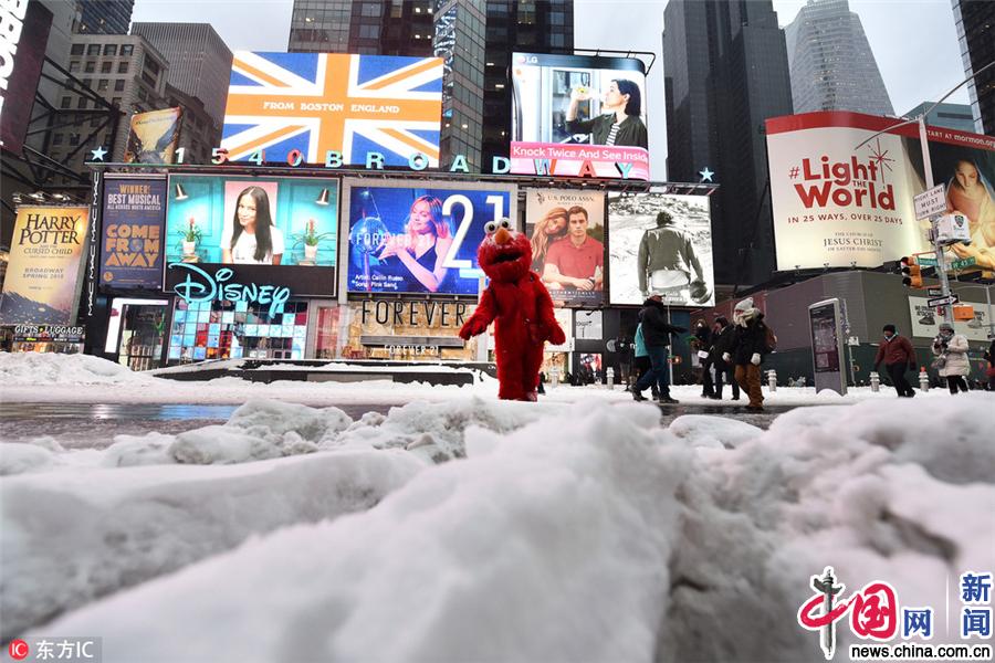 当地时间2018年1月4日,美国纽约,民众在雪地里打雪仗、滑雪狂欢。罕见暴风雪3日晚至4日席卷美国东北部,部分地区已宣布进入紧急状态。Mark Lennihan/东方IC