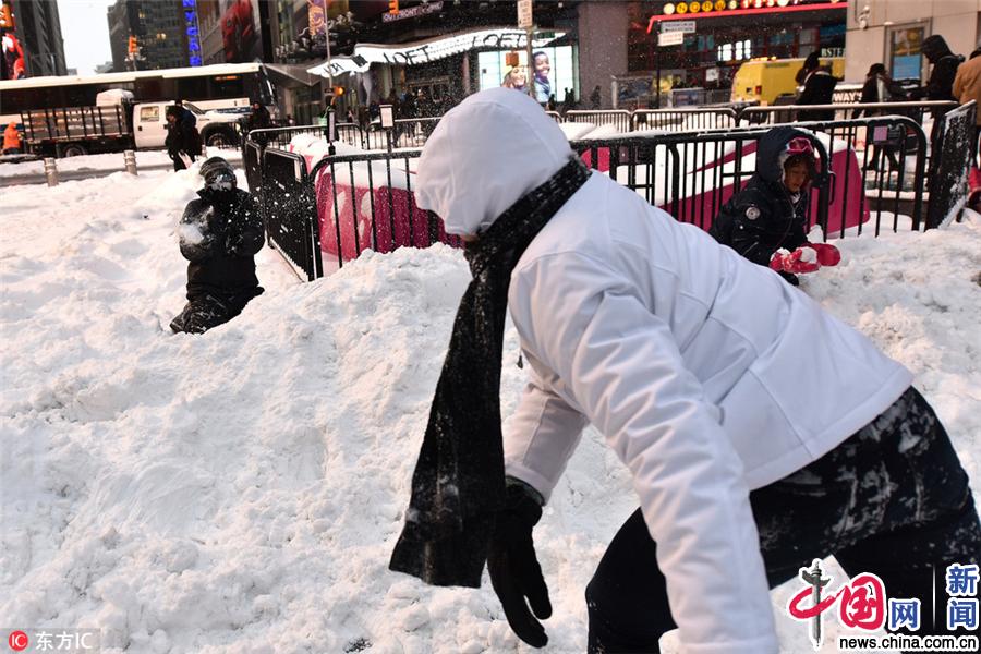 当地时间2018年1月4日,美国纽约,民众在雪地里打雪仗、滑雪狂欢。罕见暴风雪3日晚至4日席卷美国东北部,部分地区已宣布进入紧急状态。Mark Lennihan/东方IC