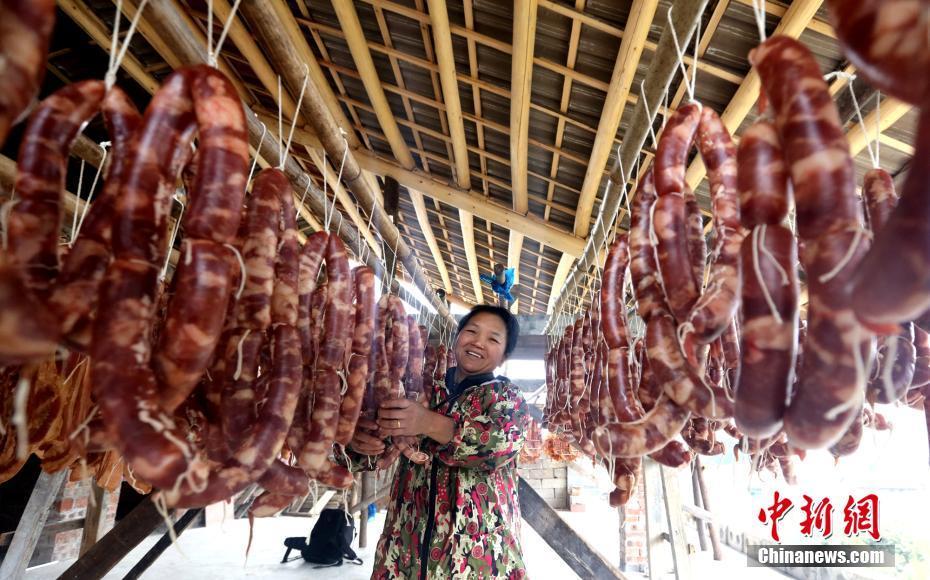 在广西三江侗族自治县丹洲镇丹洲村,村民梁玉华在整理制作好的腊肠。吴练勋摄