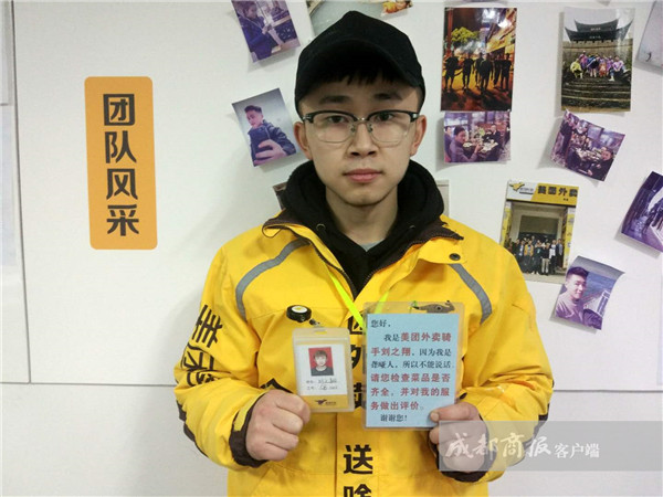 1月3日晚上,一份土豆丝,一份粉蒸排骨,加一份米饭,和22岁的刘之翔之前几天送外卖并没什么差别,取餐、送餐,很近,整个过程不过10多分钟。但他没有想到,这份普通的外卖,竟然让他被戴上了“要钱”的帽子。刘之翔通过手机打字,告诉成都商报客户端记者,他记得那是晚饭时间,他将外卖送给客人后,将挂在胸前的工作牌递给客人,但对方连工作牌上的字都没有看,就挥手让自己走。“他们以为我的工作牌就是要(他们献)爱心。”