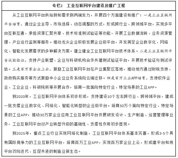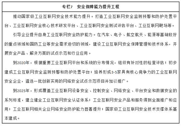 到2025年,基本形成具备国际竞争力的基础设施和产业体系。覆盖各地区、各行业的工业互联网网络基础设施基本建成。工业互联网标识解析体系不断健全并规模化推广。形成3-5个达到国际水准的工业互联网平台。产业体系较为健全,掌握关键核心技术,供给能力显著增强,形成一批具有国际竞争力的龙头企业。基本建立起较为完备可靠的工业互联网安全保障体系。新技术、新模式、新业态大规模推广应用,推动两化融合迈上新台阶。