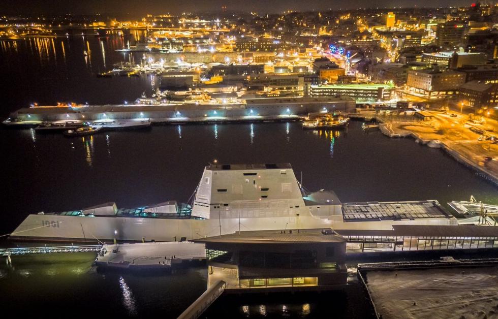 据社交媒体发布的照片显示,美国海军“朱姆沃尔特”级驱逐舰的二号舰“迈克尔·蒙苏尔”号(DDG-1001)海试期间夜泊在缅因州波特兰市。