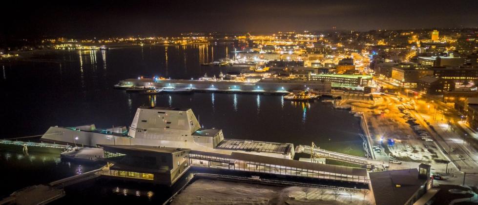 据社交媒体发布的照片显示,美国海军“朱姆沃尔特”级驱逐舰的二号舰“迈克尔·蒙苏尔”号(DDG-1001)海试期间夜泊在缅因州波特兰市。