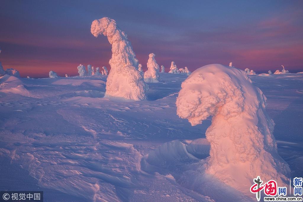 2018年1月24日讯(具体拍摄时间不详),摄影师Bazanov Andrew Sergeevich跋涉1000公里来到位于芬兰的里斯图里(Riisitunturi)国家公园,拍摄了一系列树木被大雪覆盖后的极致景观,这些奇异的照片乍一看像是外星上的场景,十分震撼。照片是大雪过后在北极圈附近拍摄的,树枝的蜿蜒被施加雪花的“魔法”,看起来像是火山爆发时被冻结的奇绝场景。那里气温低至零下40摄氏度,在极端严寒下,冰雪可以覆盖一切。Andrew Bazanov/Solent News/视觉中国