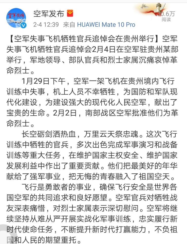 1月29日下午,空军一架飞机在贵州境内飞行训练中失事,机上人员不幸牺牲,为国防和军队现代化建设,为建设强大的现代化人民空军,献出了宝贵的生命。2月2日,南部战区空军批准他们为革命烈士。