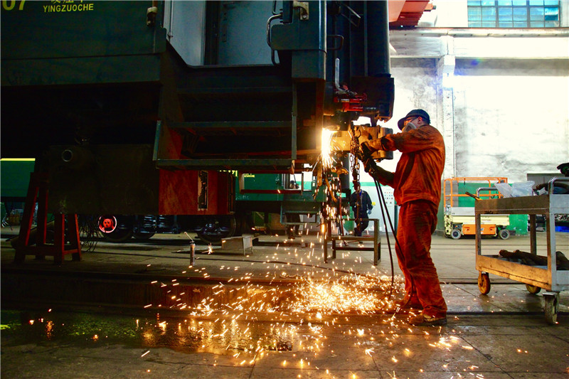 2018年2月4日,在南昌车辆段检修车间,职工宋海兵对车体端部配件进行气割作业。