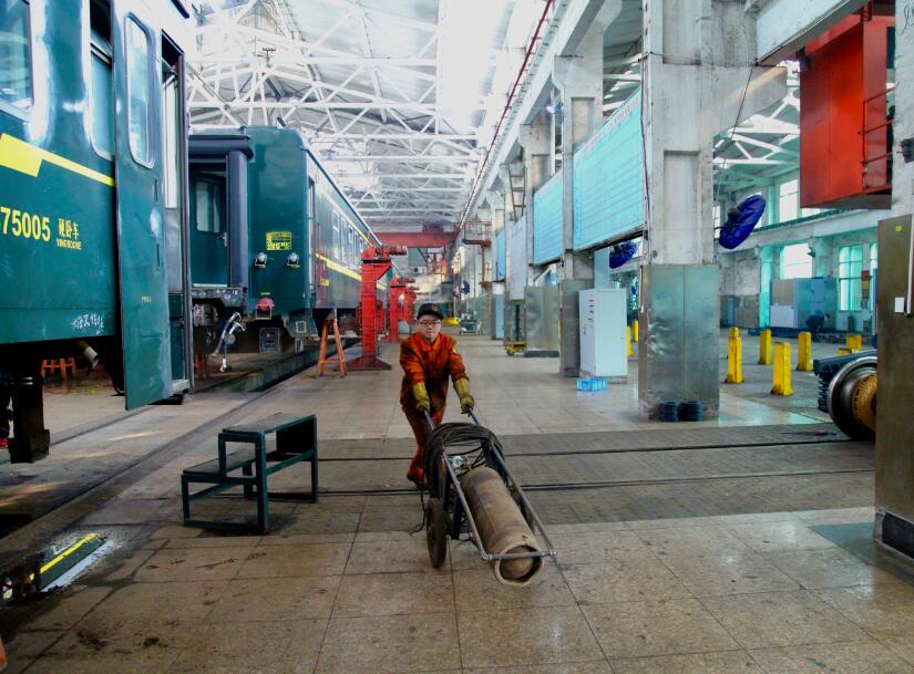 2018年2月4日,在南昌车辆段检修车间,职工王劲鸿正推着小车赶往下一个作业地点。