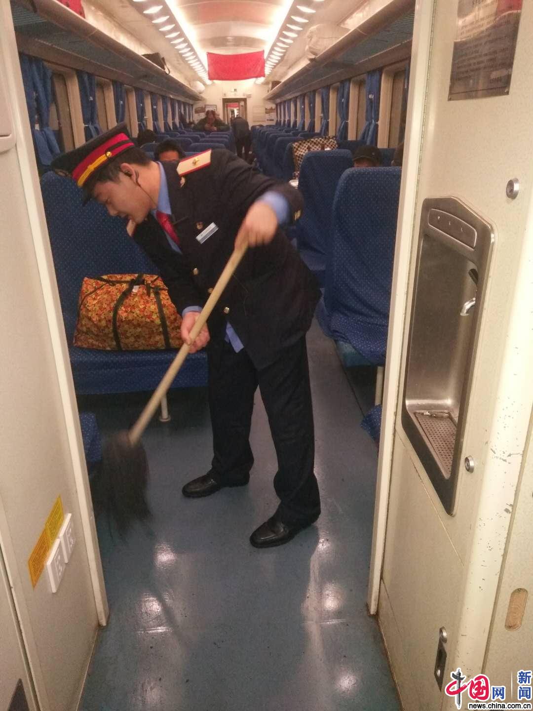 “青年号”乘务组成员清理车厢内卫生。