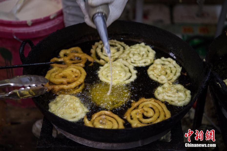 2月11日,随着藏历新年的日益临近,古城拉萨卡塞生意日渐红火。卡塞是一种油炸面食,是藏族人家款待客人的点心,也是藏历新年必备的年货之一。图为工人正在制作卡塞。中新社记者 何蓬磊 摄