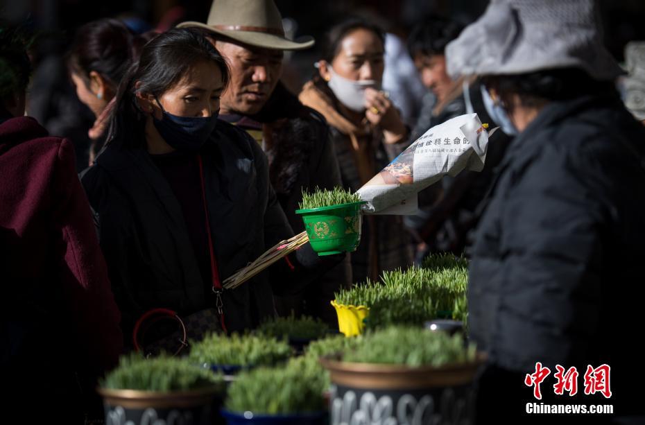 2月11日,随着春节、藏历新年的日益临近,拉萨民众开始选购卡塞、酥油花、青稞苗等年货,街头年味越来越浓。图为拉萨市民购买年货青稞苗。中新社记者 何蓬磊 摄