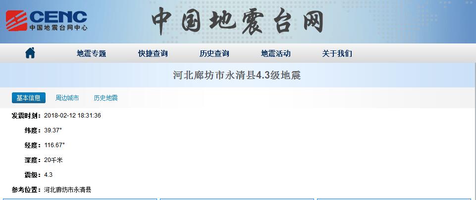 河北廊坊市永清县发生4.3级地震 震源深度20千米