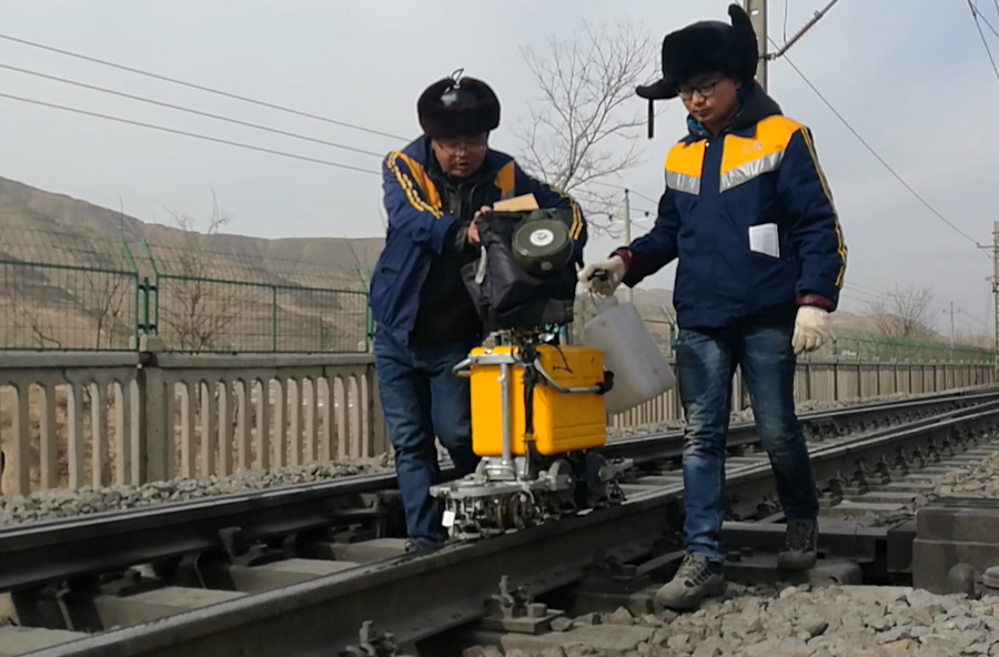受极端天气的影响,近几日,定西地区的温度低至零下十五六度,职工们在线路上作业饱受冷气流侵袭,凛冽的寒风肆意的咆哮着,但这丝毫没有影响职工的工作热情。只见他们2人1组,一人手持探伤仪,目不转睛地盯着仪器屏幕上显示的绿波,仔细查找可疑处所;另一人熟练地在钢轨轨面上涂抹耦合剂,然后用探头在轨面上来回移动,“望闻问切”、心无旁骛……一但发现钢轨有伤损,他们就在钢轨上作出特殊的记号,并通知相关线路车间及时更换。