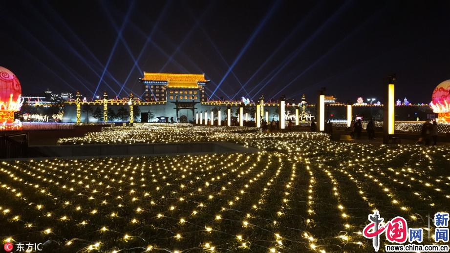 2018年2月15日春节除夕夜,陕西西安, 大红灯笼闹古城,千年古城墙上迎来了高科技精美灯展,新视觉的效果传达出浓浓的年味,吸引力了全国各地的游客前来观赏游玩。韩建超/东方IC